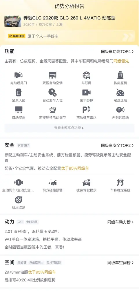 据估算,同级车的最低用车成本是5678元/年,最高是21330元/年,奔驰GLC 2020款 GLC 260 L 4MATIC 动感型是15708元/年,所以用车成本较高。