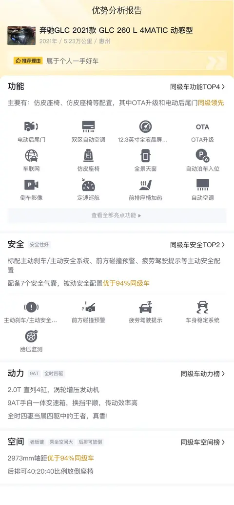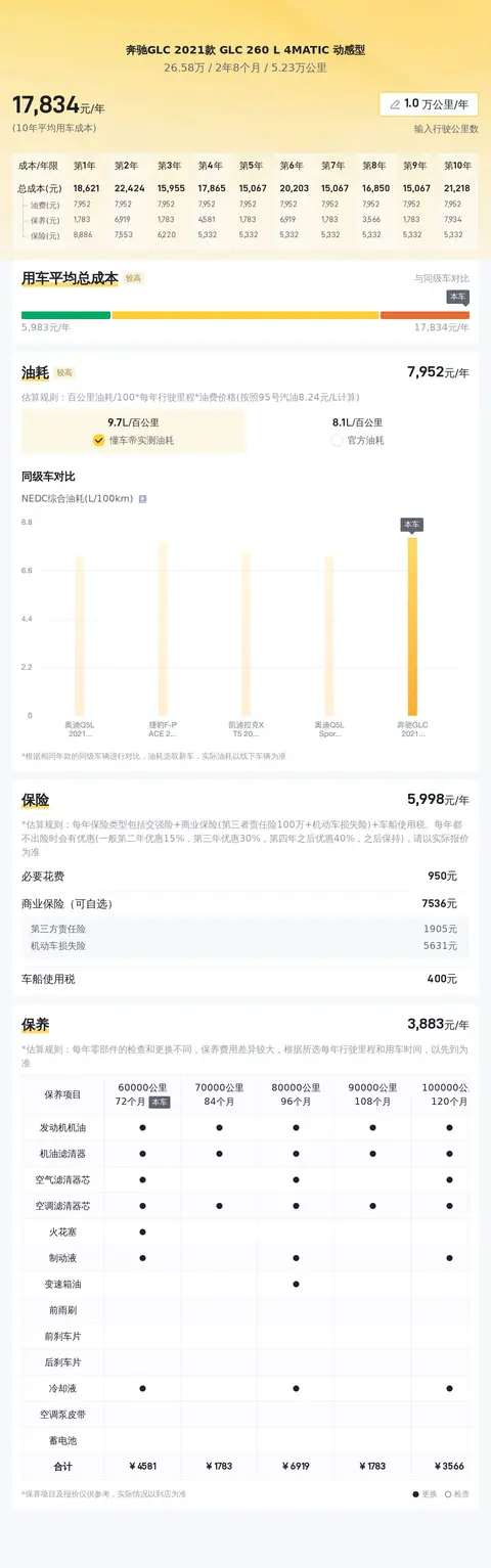 据估算,同级车的用车成本最低是5467元/年,最高是21783元/年,奔驰GLC 2021款 GLC 260 L 4MATIC 动感型的是17508元/年,不算低,但也不算高。