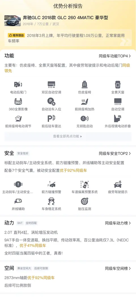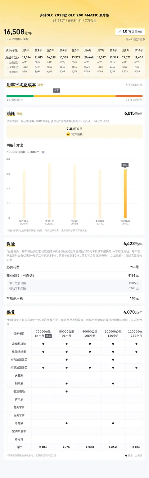 据估算,同级车的最低用车成本是12468元/年,最高是18798元/年,奔驰GLC 2018款 GLC 260 4MATIC 豪华型是16663元/年,所以用车成本不算低。