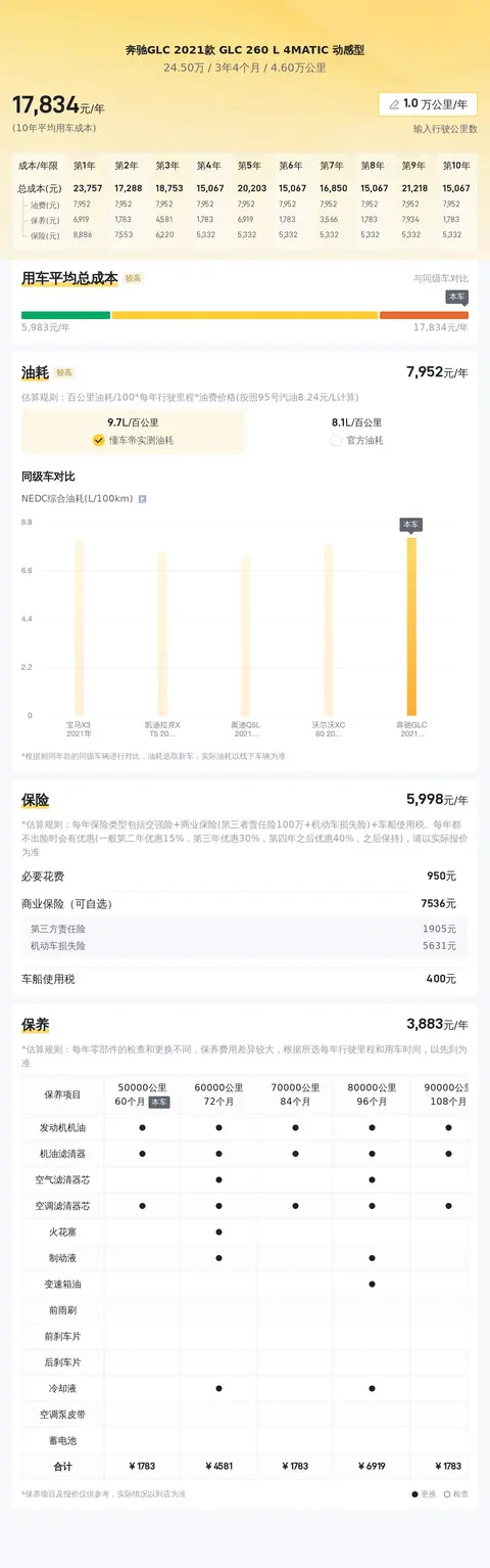 据估算,同级车的最低用车成本是12798元/年,最高是22786元/年,奔驰GLC 2021款 GLC 260 L 4MATIC 动感型是17558元/年,用车成本适中,不占优势。