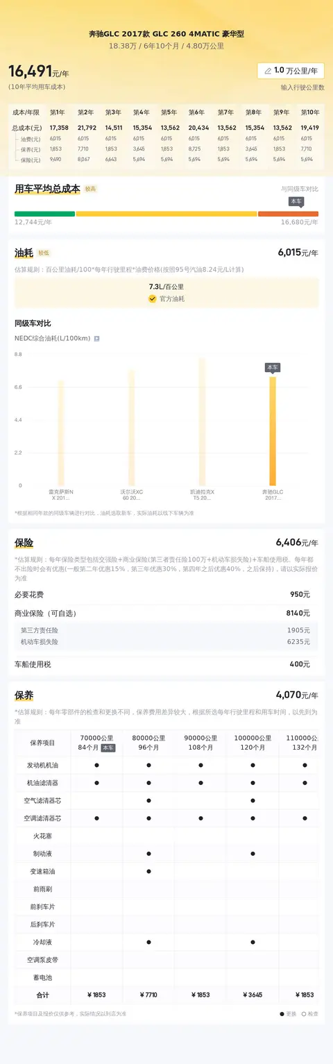 据估算,同级车的最低用车成本是13980元/年,最高是18770元/年,奔驰GLC 2017款 GLC 260 4MATIC 豪华型是16130元/年,整体不算低。