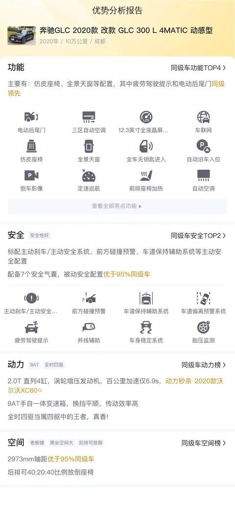不过它的价格放在市场行情里并不占优势,因为奔驰GLC 2020款 改款 GLC 300 L 4MATIC 动感型的市场行情价是26.60万-33.03万,它的报价是26.98万,价格偏低,但也不是很低,毕竟是2020款的车,又是热门款,也很好理解。