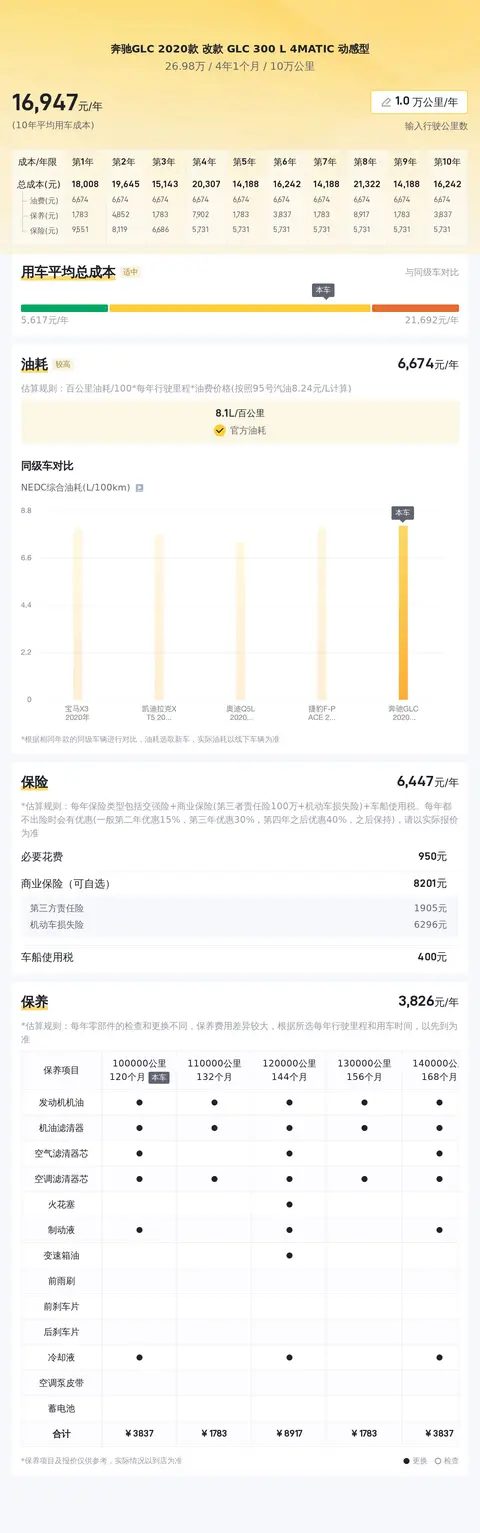 另外,同级车的最低10年平均用车成本是12973元/年,最高是20344元/年,奔驰GLC 2020款 改款 GLC 300 L 4MATIC 动感型是17055元/年,是适中的水准,不过也与它油耗低有关。