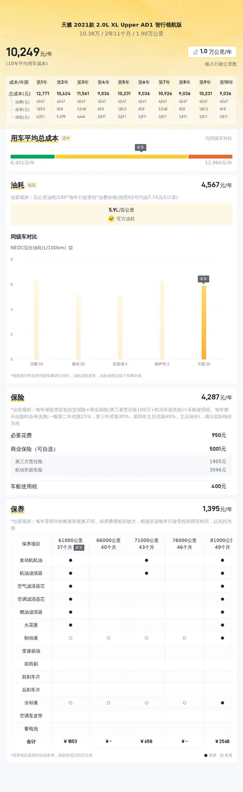 该车的使用成本较低,据懂车帝平台大数据显示,这款天籁2021款2.0L XL Upper AD1智行领航版的10年平均用车成本大概是10,187元/年,与同级车相比处于较低的水平,该车排量2.0L,油耗较低,燃油经济性较好,在乎使用成本的朋友可以放心了。