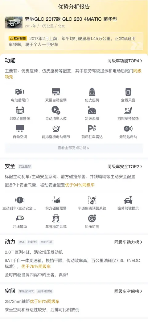 优点:奔驰GLC的知名度不用我说,大家伙都知道。这辆奔驰GLC 2017款 GLC 260 4MATIC 豪华型报价不高,只有16.98万,但是车子却只有11万公里,性能保养都跟得上,而且又是京牌,所以性价比不错。