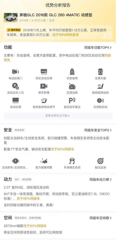 优点:奔驰GLC的名气大,市场欢迎度高,保值率也高,而且行驶里程只有9.30万公里,还具备一定的实用性。价格相对来说属于中等水平,入手压力不大。整体来看还是挺不错的。