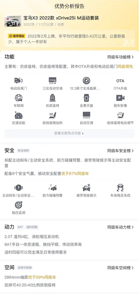 今天介绍的这款2022款宝马X3 xDrive25i M运动套装是一款中型SUV,它在同级车型中以其卓越的性能和合理的价格赢得了消费者的青睐。这款车在动力、操控、安全和舒适性方面都有着出色的表现,无论是城市驾驶还是长途旅行都能提供优质的驾乘体验。它的发动机性能强劲,燃油经济性也较高,这使得它在保持宝马品牌豪华感的同时,也具备了一定的实用性。