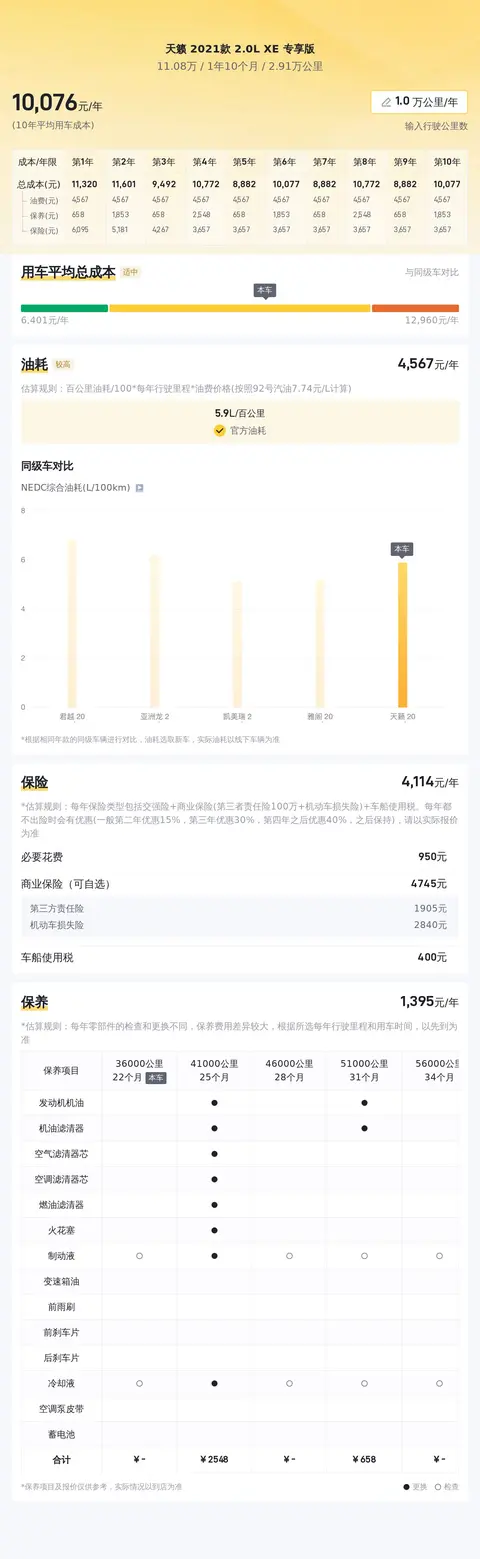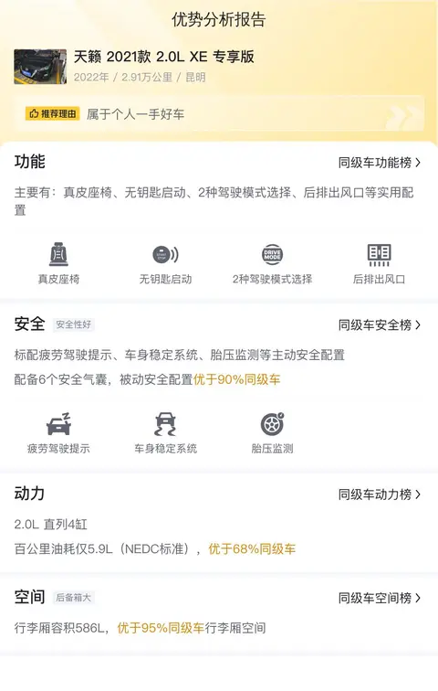 综上所述的新车含税价、用车成本、市场行情、优势分析、同款比价等数据仅供参考。在配置部分,因为二手车非标品,车辆可能会存在配置改装的情况,具体车况信息需要线下结合车辆实际情况进行综合参考。