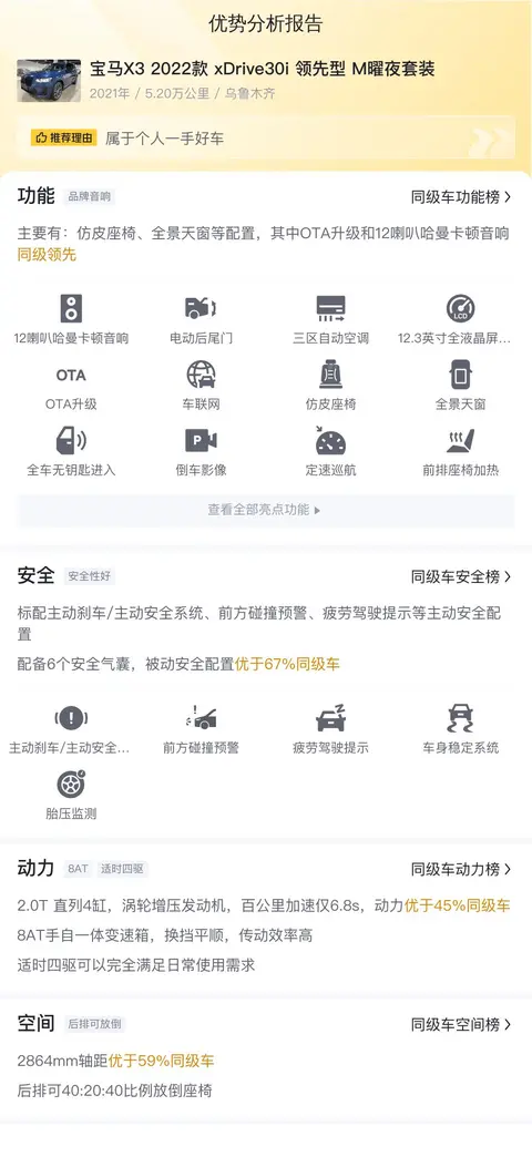 这台宝马X3 2022款 xDrive30i 领先型 M曜夜套装于2021年12月在乌鲁木齐上牌,至今行驶了5.2万公里,保持了原版原漆,0过户记录,车辆使用频率适中,可见车主对其的爱护有加。车辆外观为蓝色,内部采用深色配色方案,不仅显得更为高档,也更易于日常维护。当前这台二手车的报价为30.8万元,考虑到其车况良好且为近期热门车型,这一价格在二手车市场上颇具竞争力。
