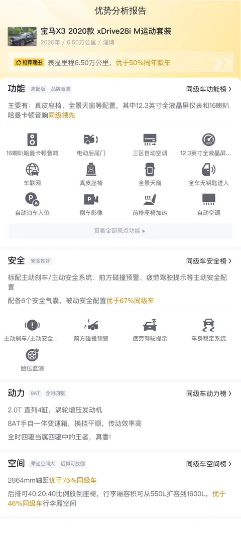 综上所述,这辆二手宝马X3 2020款 xDrive28i M运动套装虽然在价格上颇具吸引力,但车况细节尚待线下验证。宝马X3 2020款 xDrive28i M运动套装在设计、性能和配置上均体现了宝马品牌的匠心独运,其运动化的调校、豪华感的营造以及先进的科技配置,为驾驶者带来了独特的驾乘体验。作为一款二手车,它适合那些热爱驾驶、追求品质生活的消费者,他们既看重车辆的性能和品牌价值,也懂得在二手车市场中寻找超值之选。然而,潜在买家在做出购买决定前,应着重关注车辆的维护记录、实际行驶里程以及外观内饰状况,这些因素将直接影响到车辆的长期使用体验和再次转售时的价值。