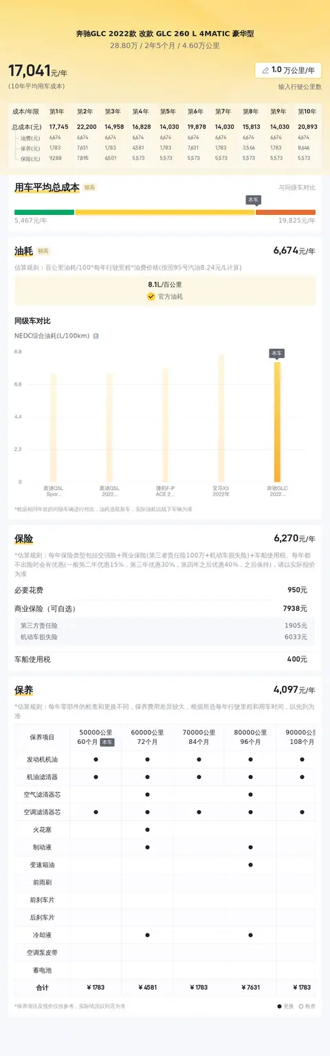 据估算,同级车的最低用车成本是5678元/年,最高是20740元/年,奔驰GLC 2022款 改款 GLC 260 L 4MATIC 豪华型是16778元/年,所以用车成本较高。