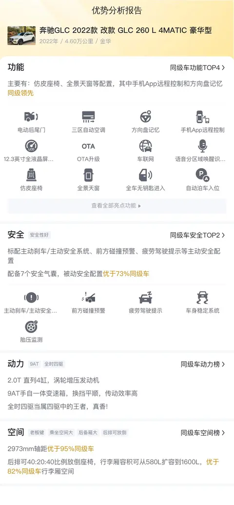 综上所述的用车成本、市场行情、优势分析、同款比价等数据仅供参考,车况信息需要线下结合车辆实际情况进行综合参考,建议以实际体验为准。这款二手奔驰GLC 2022款 改款 GLC 260 L 4MATIC 豪华型的主要问题就是价格偏高,如果可以接受这个价格,其他方面还是不错的,尤其是外观很新,配置丰富,有这方面需求的朋友可以考虑。反之,则要量力而行了。