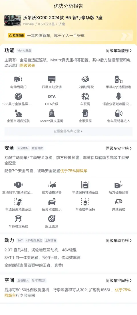 2024款的车,所以配置自然是不低。沃尔沃XC90 2024款 B5 智行豪华版 7座配备了Nappa真皮座椅、第二排电动调节、前排座椅加热通风、手机无线充电、L2辅助驾驶、360度全景影像、倒车影像、雄鹰视线系统、前后驻车辅助系统、主动刹车、车道保持辅助系统、车道偏离预警系统、车身稳定系统等配置。安全配置上,标配主动刹车/主动安全系统、前方碰撞预警、车道保持辅助系统等主动安全配置,配备8个安全气囊,被动安全配置优于87%同级车。