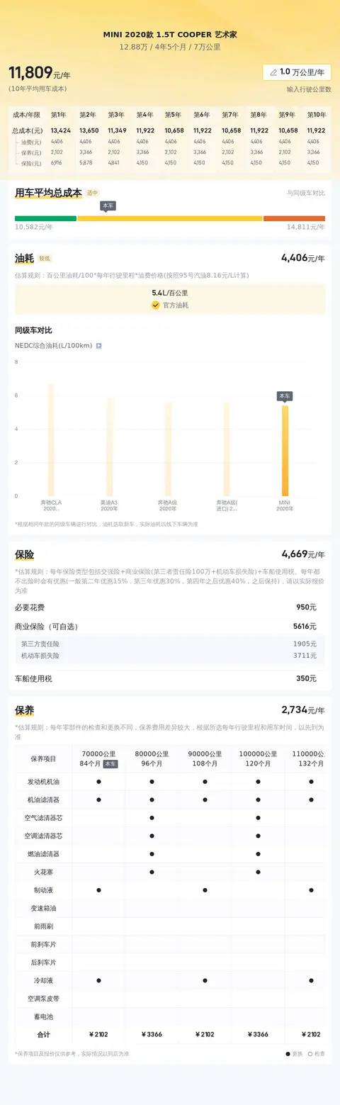 同时据估算,同级车的最低用车成本是5190元/年,最高是12471元/年,而MINI 2020款 1.5T COOPER 艺术家是12471元/年,所以用车成本较高。