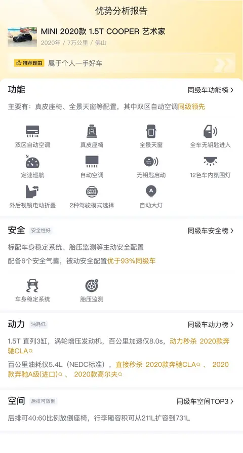 说句良心话,MINI开起来确实带劲,小巧的身材,不俗的动力,尤其是跑在拥堵的城市里,别提有多轻松了。不过,这辆二手MINI 2020款 1.5T COOPER 艺术家虽说价格不高,但是用车成本并不算低,而且内部空间并不理想,这些属于是买车的时候需要着重考虑的点,尤其是需要考虑家庭用车的朋友,更需要量力而行。