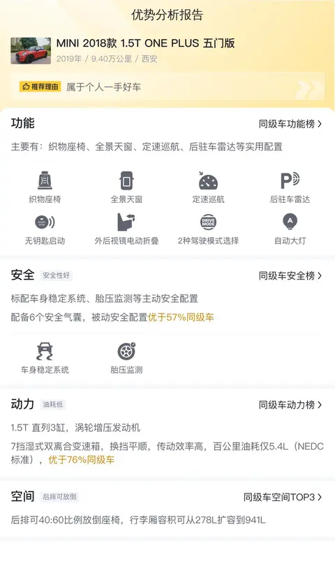 据估算,同级车的最低用车成本是4553元/年,最高是13178元/年,MINI 2018款 1.5T ONE PLUS 五门版是10678元/年,用车成本较高。