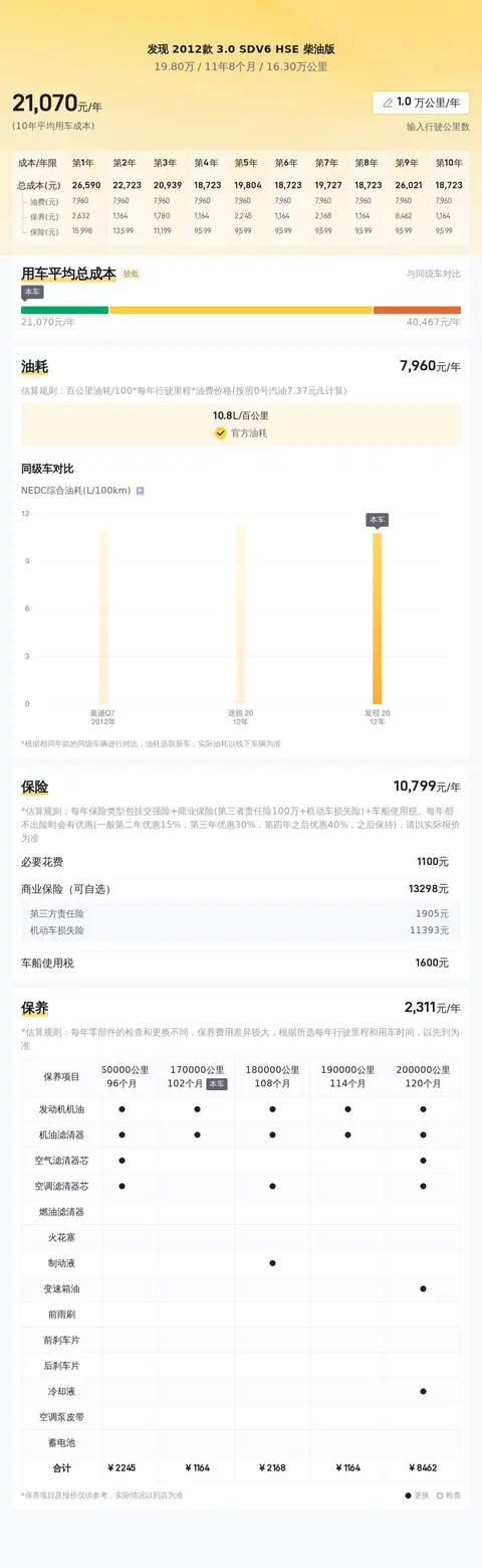 至于市场行情和用车成本方面,根据懂车帝的数据,这款发现的市场行情在20.78万至26.94万之间,而它的报价仅为19.80万,比同车系均价低了23%,这无疑是一个相当吸引人的价格。此外,这款车的保值率也相当高,达到了52.07%,远超同级别的其他车型。这主要是因为发现系列车型一直以来都以其出色的性能、精致的内饰和丰富的配置著称于世,因此在二手车市场上也备受追捧。而在用车成本方面,这款车的平均用车成本为21278元/年,这在同级别车型中处于较高水平。不过考虑到这款车的性能和配置,这一成本仍在合理范围内。总的来说,这款车是一辆性能出色、配置丰富且保值率高的中大型SUV,适合那些追求品质和性价比的消费者购买。