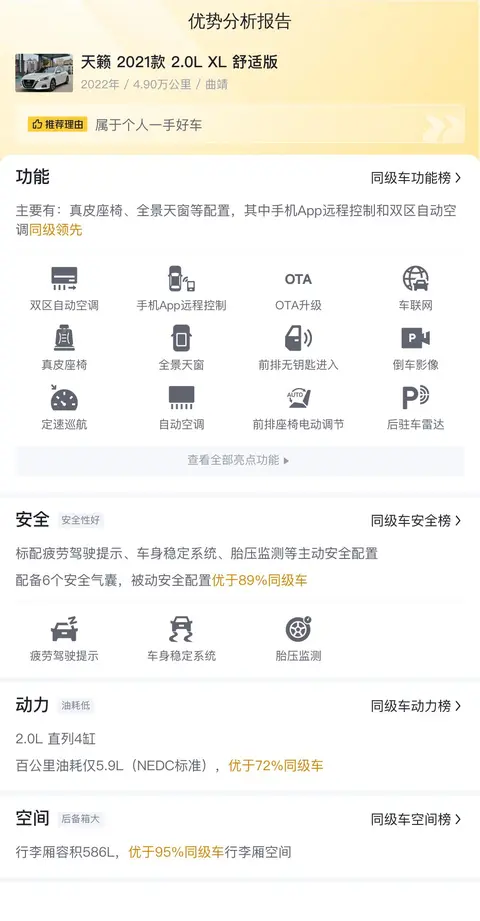 综上所述,2021款天籁2.0L XL 舒适版在市场价值和用车成本方面均表现出色。它不仅拥有卓越的性能和舒适的乘坐体验,同时还具备较高的保值率和较低的用车成本。这些优势使得它成为了二手车市场上的热门选择,无论是作为家庭用车还是个人代步工具,都能够满足车主的需求并带来满意的使用体验。