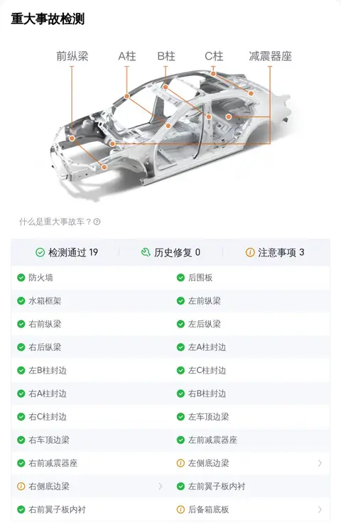 接着,我们要谈的是车辆的事故检测情况。事故检测是为了排查车辆是否存在严重结构性损伤,这是评估一辆车整体安全性和结构完整性的关键检查。虽然车辆通过了大部分检查,但在左侧底边梁和右侧底边梁发现了划伤,后备箱底板有脏污,这些并不是事故导致,不然也不可能通过事故检测。但出于对买家权益的绝对保护,我们坚持透明展示所有细节,赋予您全面了解车况的权利。