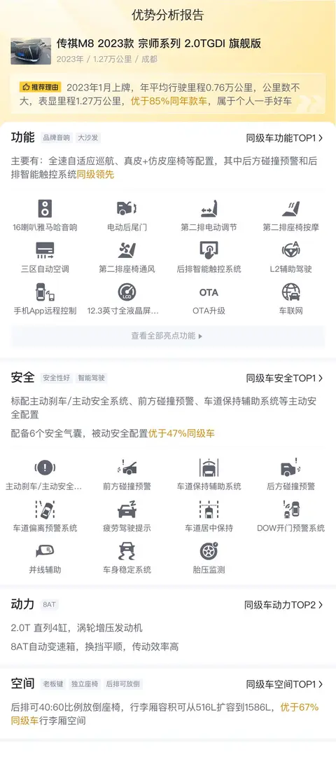 综上所述,这辆二手传祺M8 2023款宗师系列2.0TGDI旗舰版在车况、市场行情、用车成本、配置与安全、驾乘感受和空间、动力性能等方面均表现出色。作为一款商务与家庭兼备的MPV,传祺M8凭借其卓越的品质和良好的用户口碑,成为了市场中的佼佼者。对于追求高品质生活的消费者来说,这款车无疑是一个值得考虑的选择。