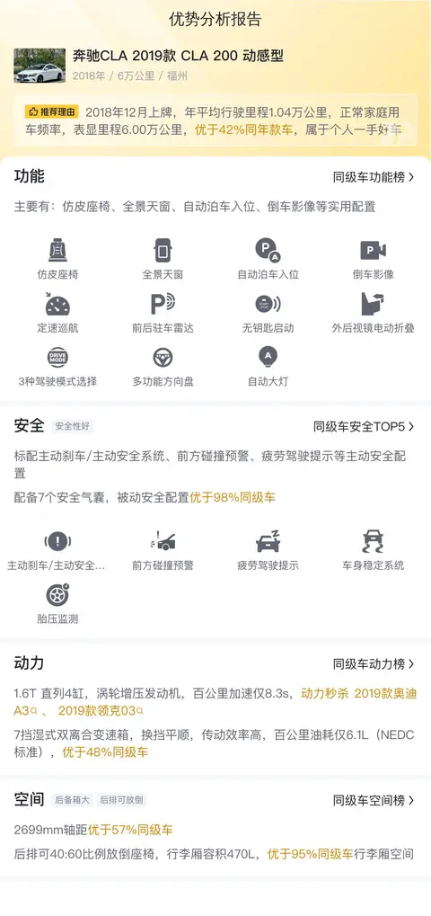 市场价格部分,当前这款二手奔驰CLA 2019款 CLA 200 动感型的市场价在12.16万到15.18万之间,当然具体售价因车况而有所不同,我们今天为您带来的这辆车报价为10.68万,属于比较实惠的报价,同时本车系为全国紧凑型车销量榜Top42,是平行进口热销车型,市场认可度较高,保值率也比较高,未来三年内折价较少。