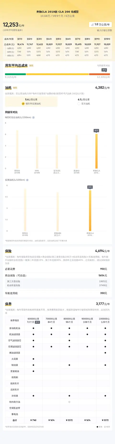 关于用车成本部分,这辆车的官方公布的百公里油耗为6.1升,按每年行驶两万公里计算,燃油费用约为9664元,百公里油耗较低,燃油成本也相对较少,这辆车的年保养费用约4380元,年保险费用约4944元,十年平均保养费用10306元,在同级别车型里面处于适中区间,这辆车的内饰有部分瑕疵,会增加少量维修或整备成本,以上数据仅供参考,实际用车成本可能根据用车场景和个人用车习惯有所不同。