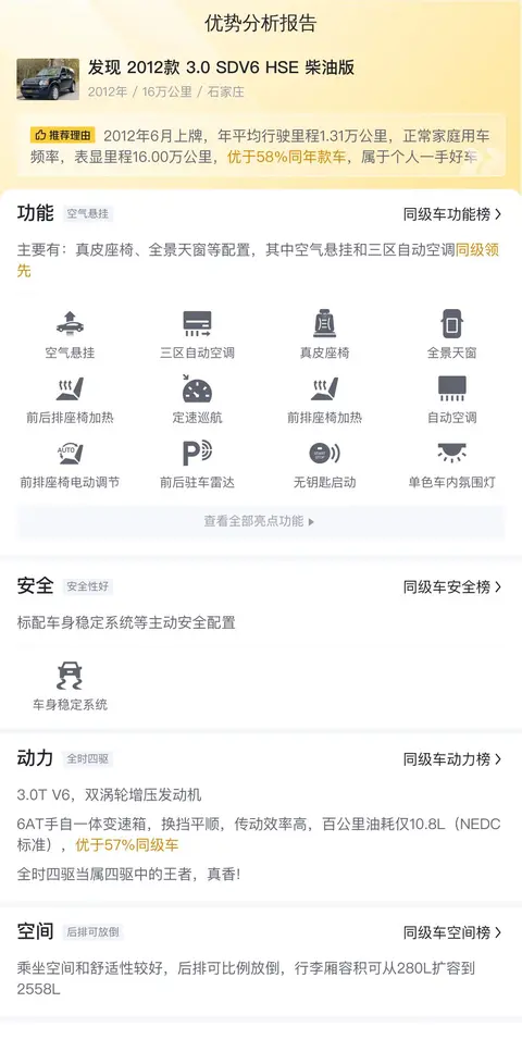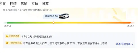 根据懂车帝的数据,这辆二手发现2012款3.0 SDV6 HSE柴油版的售价在18.34万至25.25万元之间,其当前报价为20.97万元,处于合理区间内。按当前车况计算,未来三年内,该车的折价金额预计约为4.68万元,显示出较好的保值能力。在用车成本方面,该车的年均综合用车成本约为2.1万元,这一数字与大多数同级别车型相比,处于适中的水平,对于大多数消费者而言,仍然是可以接受的。需要注意的是,车辆的实际成交价将受到多种因素的影响,包括使用年限、行驶里程、车辆保养状态等,而实际车况将是决定成交价格的关键要素。因此,在购买二手车时,建议消费者不仅要关注车辆的价格,更要仔细检查车辆的实际状况,以确保购买到一辆性价比高、车况良好的车辆。
