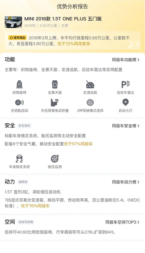 想跟大家介绍一位有点特别的“小白鞋”——一辆行驶了3.8万公里的二手MINI 2018款 1.5T ONE PLUS 五门版。它2019年3月在太原上的车牌,有过3次过户记录,如今报价14.3万。这辆车啊,就像是汽车界的“小白鞋”,经典又百搭,但这位“小白鞋”有点不一样,它更像是一双限量版,让人忍不住想一探究竟。