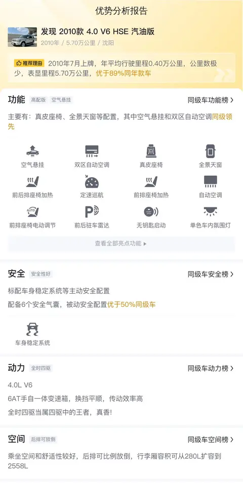 综上所述,这款发现 2010款 4.0 V6 HSE 汽油版在舒适性、动力性能、安全配置、内部空间等方面表现出色,是一款值得考虑的SUV。然而,作为一款早期的车型,它在内饰材质、科技配置、维修保养成本等方面还存在一些不足之处。如果您正在寻找一款宽敞舒适、动力强劲且适合多人出行的SUV,那么这款车型或许是一个不错的选择。然而,如果您更加注重内饰品质、科技配置或维修保养成本等方面,可能还需要考虑其他更新型的车型。在做出购买决策之前,建议您充分了解自己的需求和预算,对比考察同级别的其他车型,以便做出更加明智的选择。同时,对于二手车的购买,还需要特别关注车辆的实际状况、历史记录以及维修保养情况等因素,避免因为车辆问题带来不必要的麻烦和经济损失。