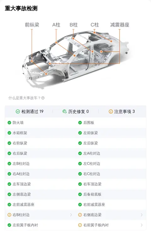 此外,在重大事故检测中,有3处瑕疵,分别是右侧底边梁、右B柱封边和右前翼子板内衬处,都有不同程度的损伤,但不影响使用。