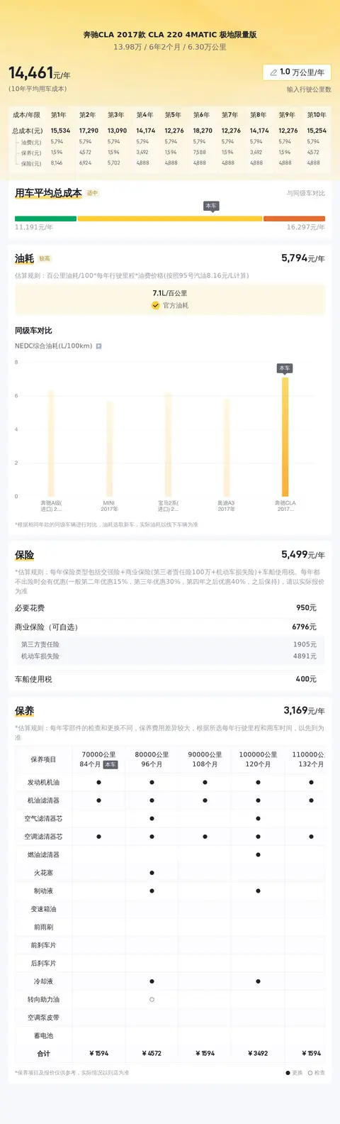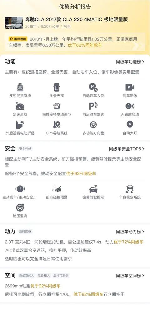 我们要介绍的奔驰CLA 2017款 CLA 220 4MATIC 极地限量版,新车含税价为37.18万,现在的二手车报价是13.98万,2018年7月首次上牌,在此期间过户2次。