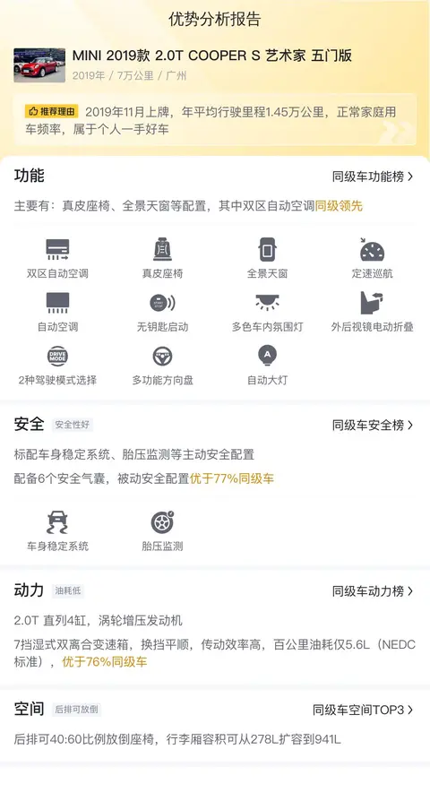 根据对等价位二手车的对比分析,这辆二手MINI 2019款 2.0T COOPER S 艺术家 五门版在外观设计、动力性能、安全配置和内部空间等方面均表现出色。尤其是其外观设计和动力性能,相较于同级车更具吸引力和竞争力。同时,在安全配置和内部空间方面也能满足大多数消费者的需求和期待。综合来看,这是一辆值得推荐和考虑的二手车。