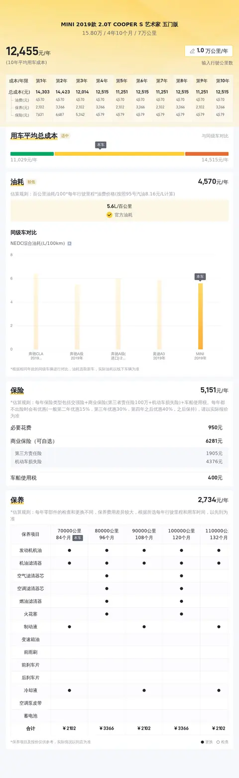 关于用车成本,二手MINI 2019款 2.0T COOPER S 艺术家 五门版的平均用车成本为 12453 元/年,具体用车成本则跟车主的用车习惯挂钩。