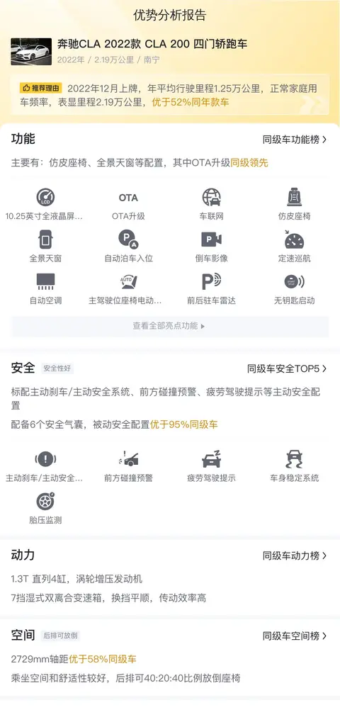 优点:奔驰CLA一直是许多车迷心中的梦想之车,尤其是年轻消费者。它的设计充满了青春的活力与时尚感,非常容易让人一见钟情。车子上牌时间不长,使用不多,配置丰富,品牌名气大,保值率高。
