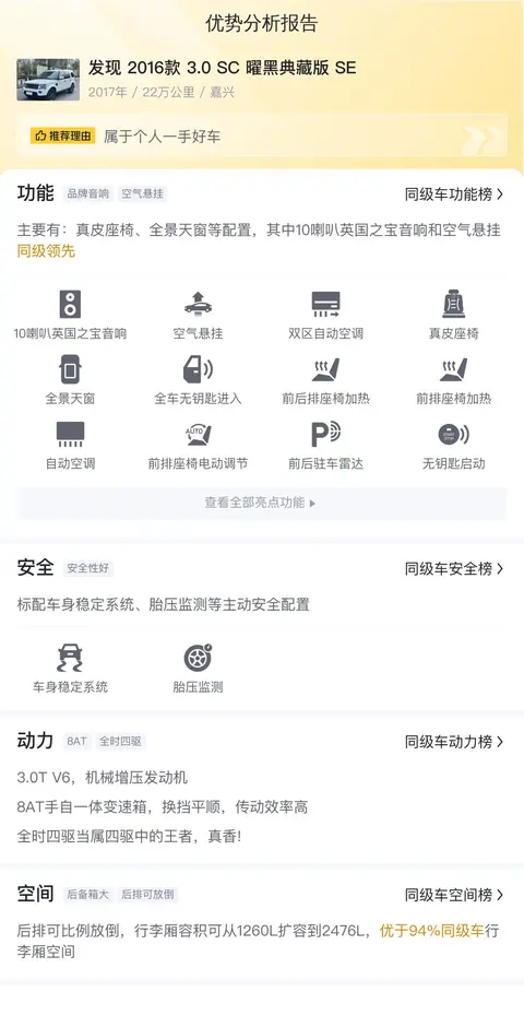 [这辆发现2016款3.0SC曜黑典藏版SE在配置上相当丰富,包括了无钥匙启动、定速巡航、自动驻车、上坡辅助、方向盘加热、前排座椅记忆等多项实用功能。其中无钥匙启动这一配置让车辆启动更加方便快捷,驾驶者只需携带钥匙靠近车辆,即可实现无需插入钥匙即可启动车辆,提高了出行的便利性。上坡辅助可以在车辆上坡起步时提供稳定的制动力,防止车辆后溜,使驾驶者在坡道起步更加轻松安全。当然这其中还有很多配置这里不一一列举了。