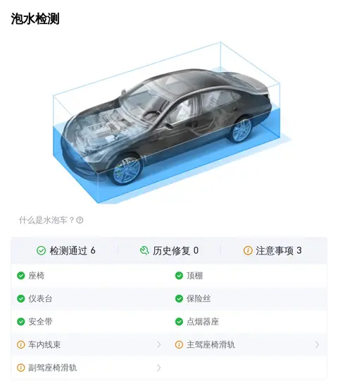 [在车况部分,除了外观、内饰功能的检测,更多买家关注的是这辆车是否为“三非”车辆,三非就是指非重大事故、非火烧、非水泡。因为事故车、泡水车、火烧车都存在较大的安全隐患。不过您放心,这辆车已经通过了事故检测、火烧检测和泡水检测,可以确定它非重大事故车、非火烧车、非泡水车。