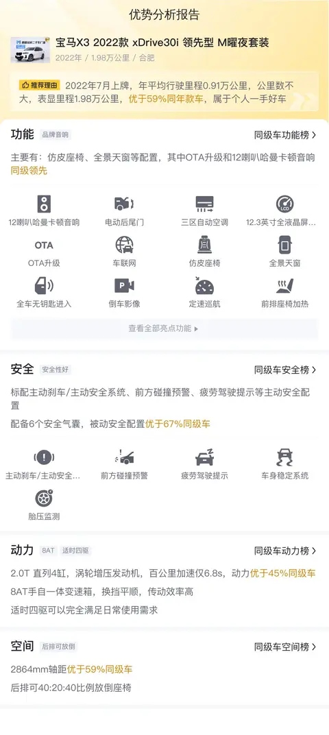 这辆二手宝马X3 2022款 xDrive30i 领先型 M曜夜套装,表显里程1.98万公里,上牌日期2022年7月,车牌所在地和车辆所在地均为合肥,车身颜色为白色,0过户。二手车现价28.6万元,相较于新车指导价43.68万元,价格优惠了15.08万元。
