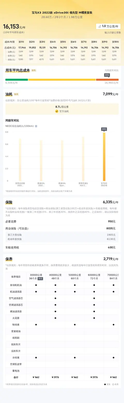 基于懂车帝的大数据分析,该车型的十年平均用车成本约为16186元/年,相较于同级别车型,其综合用车成本在可接受范围内。需要注意的是,实际费用会根据车主的实际使用状况有所变动。