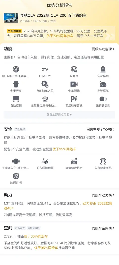 同时根据估算,奔驰CLA 2022款 CLA 200 五门猎跑车的用车成本也偏高,因为同级车的最低用车成本是6501元/年,最高是12784元/年,而它的则是11551元/年。