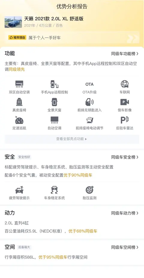 综上所述的新车含税价、用车成本、市场行情、优势分析、同款比价等数据仅供参考。在配置部分,因为二手车非标品,车辆可能会存在配置改装的情况,具体车况信息需要线下结合车辆实际情况进行综合参考。
