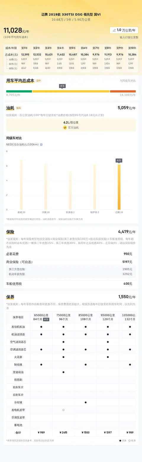 除了购车费用,我们估算了这款迈腾的年均综合用车成本约为1.1万元,但实际支出可能会根据使用强度和维护情况有所变动。