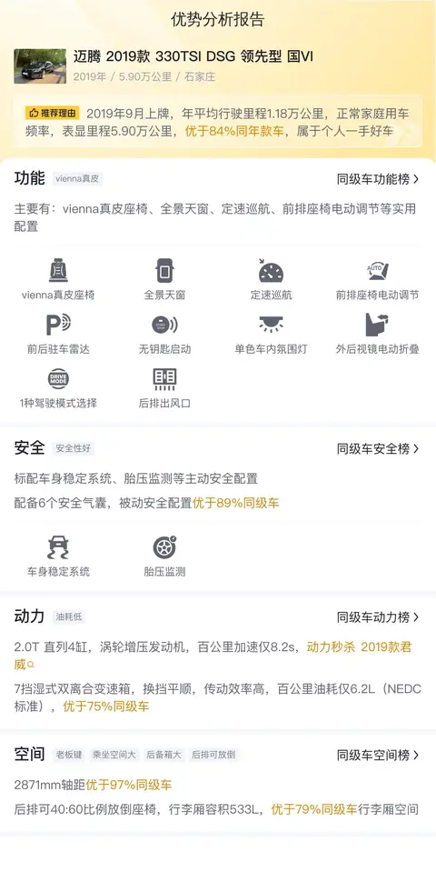 该车具体版本为2019款迈腾330TSI DSG领先型国VI,2019年9月上牌,行驶里程5.9万公里,0过户,车源所在地和牌照所在地均为石家庄。该车当时的新车指导价21.51万,目前二手车报价10.68万,几乎半价的出售,还是挺诱人的。