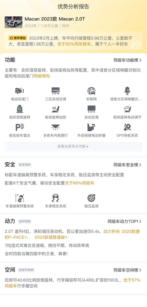 缺点当然是价格了,毕竟这辆Macan 2023款 Macan 2.0T的报价略高于市场行情,不过胜在车况足够精品,也算弥补了价格上的偏差。