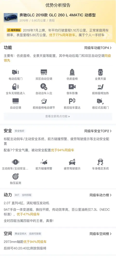综上所述,这辆二手奔驰GLC 2019款 GLC 260 L 4MATIC 动感型在车况、配置、动力性能以及用车成本等方面都表现出色。虽然外观和内饰有些许瑕疵,但并不影响日常使用。如果您正在寻找一款豪华SUV作为日常代步或长途自驾之选,那么这辆二手奔驰GLC无疑是一个不错的选择。当然,在购买二手车时还需要考虑个人需求、预算以及车况保养情况等因素,建议您在专业人士的陪同下实地考察并试驾车辆,以便更全面地了解车辆状况并做出明智的购买决策。