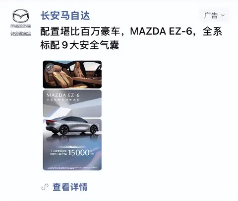 这款马自达EZ-6之所以在广告上宣称媲美百万级别的豪车,主要是全系标配了9个安全气囊。那么你觉得这属于百万级别的配置吗?我觉得并不算,这不是什么罕见设计,因为很多新车上很常见了。