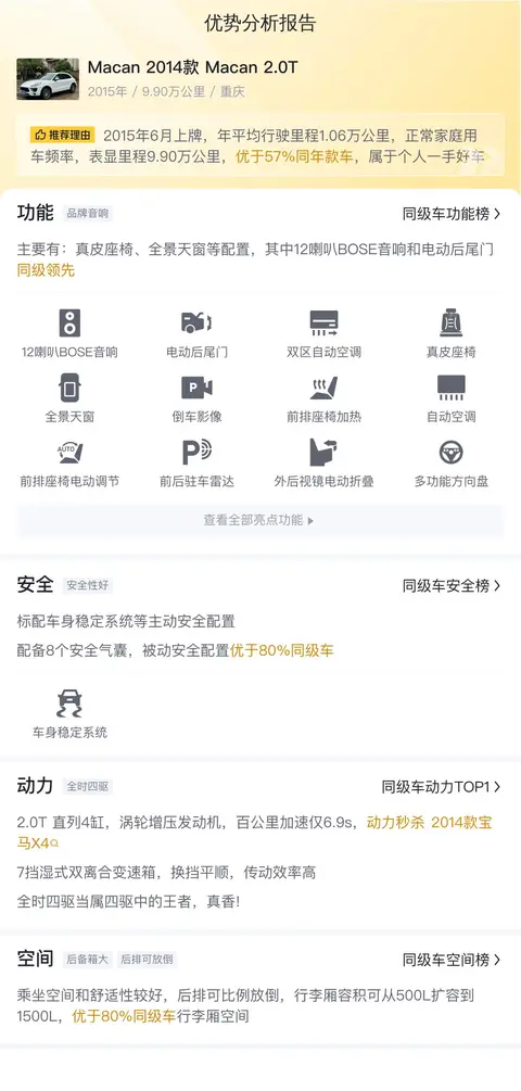 这款Macan车型在多个方面展现出了显著的优势。首先,它搭载的2.0T发动机在提供充沛动力的同时,也展现了较好的燃油经济性,这对于日常使用来说是一个大大的加分项。其次,车辆的内饰采用了高档材质,设计上充满了保时捷特有的豪华感和精致感,为驾驶者和乘客带来了优质的驾乘体验。此外,Macan还配备了丰富的驾驶辅助和舒适配置,如倒车影像、定速巡航等,这些配置提升了驾驶的便捷性和安全性。然而,这款车型也存在一些不足之处。由于Macan采用了较为运动化的悬挂调校,因此在极端恶劣的路况下,乘客的舒适性可能会受到一定影响,特别是在不平整道路上行驶时,车辆的颠簸感可能会比较明显。另外,尽管Macan的内部空间相对宽敞,但与其他同级别SUV相比,它的后排空间可能稍显局促,对于需要经常携带多名成人乘客的用户来说,这可能是一个需要考虑的因素。尽管Macan在内饰豪华感、动力性能和驾驶配置方面表现出色,但其后排空间和舒适性在极端路况下可能不尽如人意。总体而言,Macan是一款集豪华与性能于一身的中型SUV,对于那些追求驾驶乐趣和高品质生活的消费者来说,它无疑是一个理想的选择。