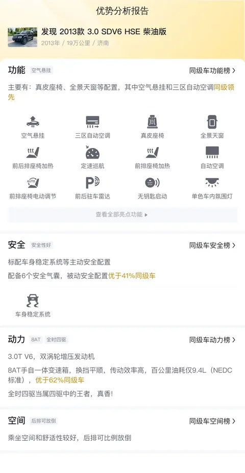 总结而言,这款2013款路虎发现3.0 SDV6 HSE柴油版车型凭借其强劲的动力、豪华的配置以及卓越的越野能力,无疑是那些渴望征服野外、追求驾驶乐趣的人士的理想之选。尽管已经行驶了19万公里且有过3次过户,但若维护得当,它依旧能够展现出不俗的性能与舒适性。对于有意购买二手车的消费者而言,这款车型无疑是一个值得考虑的选择。但请记住,在做出购买决策之前,一定要亲自查看车辆实际情况,并向卖家详细了解车辆的历史记录及维护保养情况。