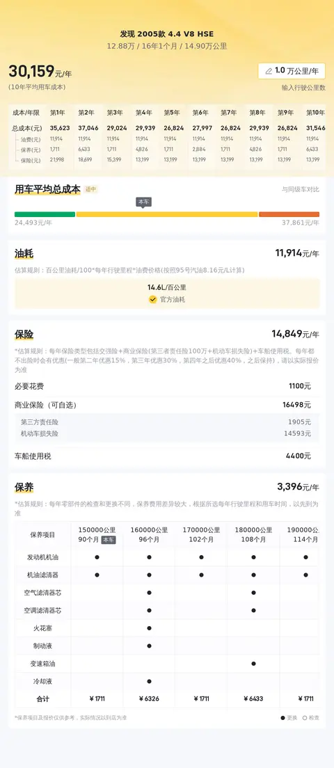 关于用车成本方面,该车官方公布的百公里油耗为14.6升。按每年行驶2万公里、每升汽油8.5元计算,每年的油费约为25960元。由于该车已行驶14.9万公里且使用年限较长,预计每年需要约5000元用于保养。保险费用方面,预估每年约为8700元。综上所述,该车的年均综合用车成本约为3万元左右。