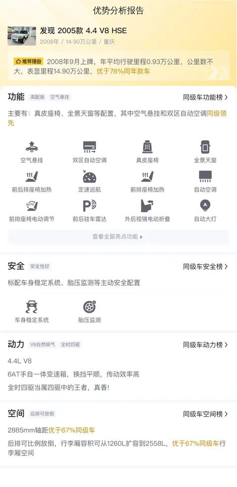 发现(图片|配置|询价),是路虎品牌旗下的一款中大型SUV,从1989年第一代车型上市至今,已经经历了五代的更迭。2004年,第二代发现进行了全面升级,并正式更名为Discovery,开始进军全球市场。今天,我们要向您介绍的,便是一辆二手路虎发现,具体版本为——发现 2005款 4.4 V8 HSE。该车于2008年9月正式上牌,截至目前,该车已行驶14.9万公里,共有过4次过户记录。该车新车指导价为109.8万,目前二手车报价为12.88万,车源所在地及上牌地均为重庆。