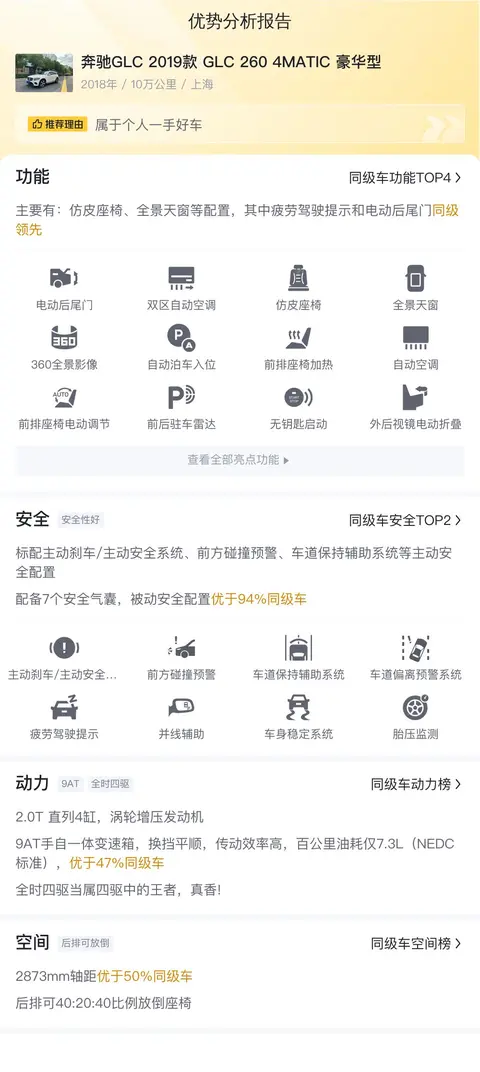 咱们今天看到的这辆二手奔驰GLC 2019款 GLC 260 4MATIC 豪华型来自上海,车牌地也是上海,首次上牌时间为2018年11月。截至目前,该车行驶里程为10万公里,排放标准为国V,有0次过户记录。新车指导价为44.50万元,目前二手车报价为16.90万元,相较于新车指导价,相当于便宜了27.60万元。